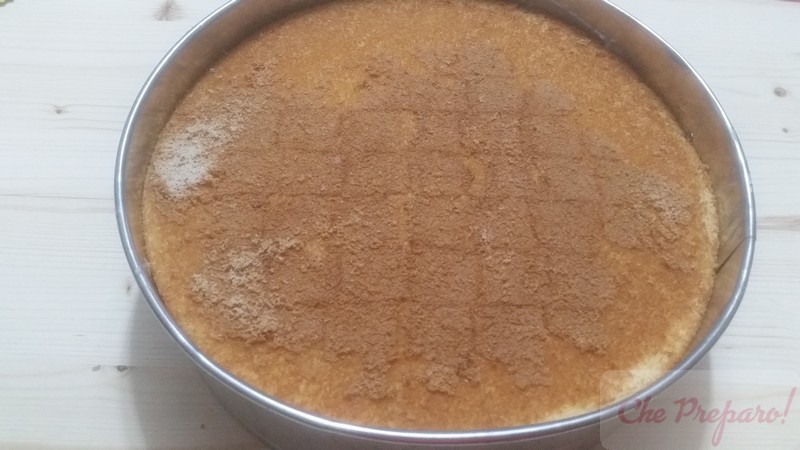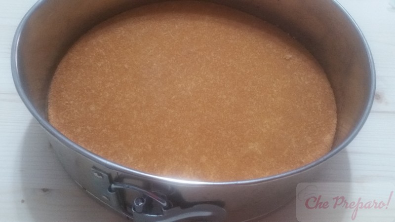- Prendiamo uno stampo a cerniera di 26 cm di diametro, sul fondo mettiamo il 1° disco di pan di spagna e lo bagnamo con il nostro sciroppo al rum, ma non troppo, poi farciamo il dolce con la crema di ricotta, che abbiamo preparato il giorno prima.