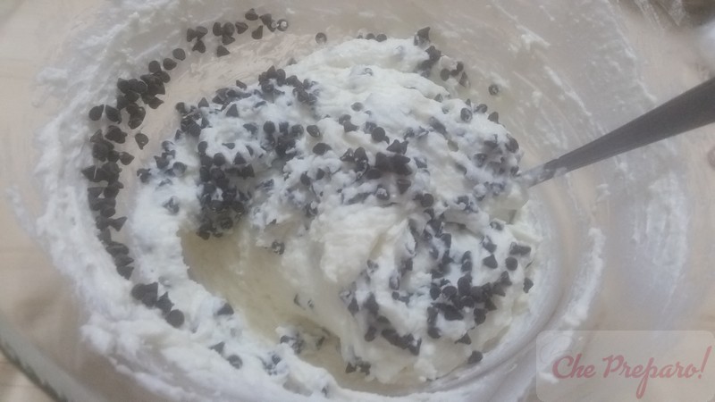 - Prima di aggiungere le gocce di cioccolato fondente tenete da parte 200 g di ricotta, vi serviranno per la decorazione. A questo punto aggiungete le gocce di cioccolato e riponete la crema di ricotta in frigo per 12 ore.