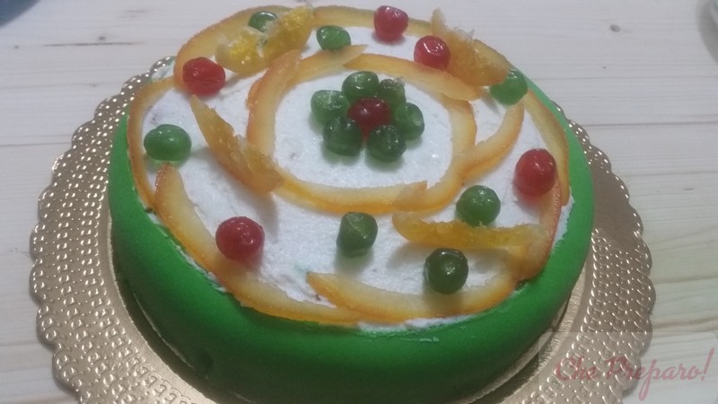 - A questo punto iniziate a decorare la cassata con la frutta candita. Tagliate a fettine sottili una scorza d’arancia candita e decorate tutto il bordo della cassata mentre nel centro posizionate le ciliegie candite. Riponete dinuovo in frigo la cassata e lasciate passare qualche ora prima di gustarla.