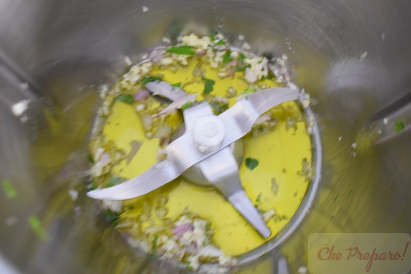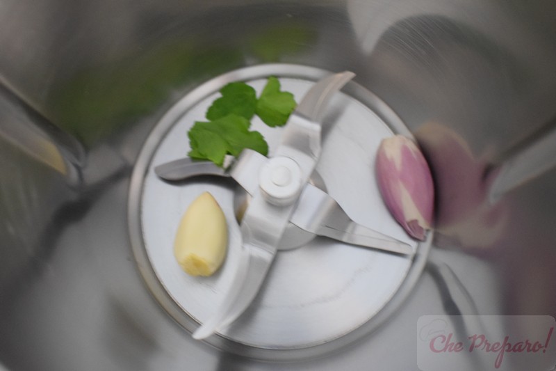 • Intanto mettete nel boccale pulito e asciutto 1 spicchio d'aglio, 1 scalogno e le foglie di prezzemolo lavato e asciugato e tritate 3 secondi/velocità 7. Riunite sul fondo con una spatola.