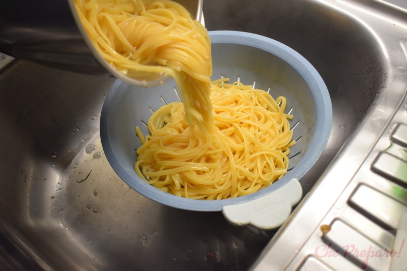 • Trascorso il tempo di cottura della pasta colatela e unitela al condimento, mescolatela e servite subito aggiungendo un giro d'olio extra vergine d'oliva a crudo e prezzemolo tritato.