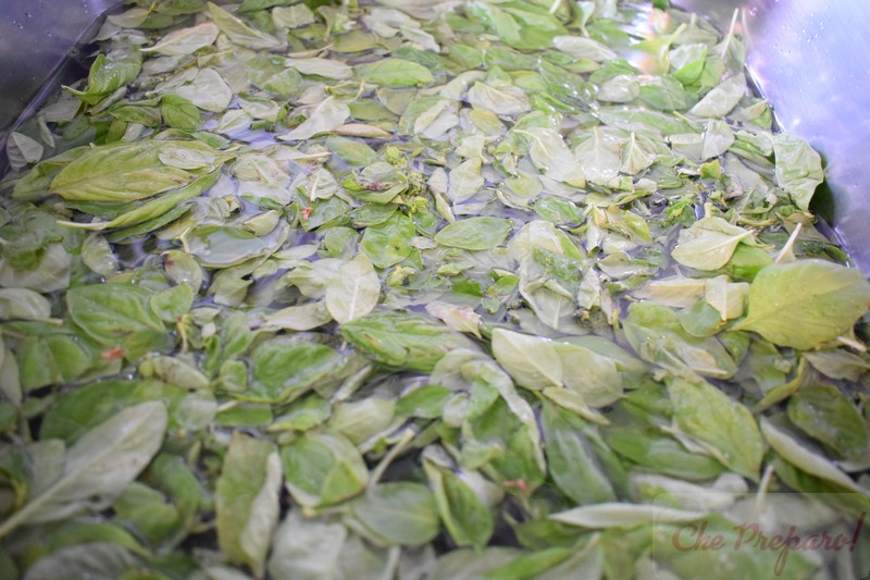 • Lavate 50 g di foglie di basilico e fatele asciugare su un canovaccio, fate attenzione a non rompere le foglie.