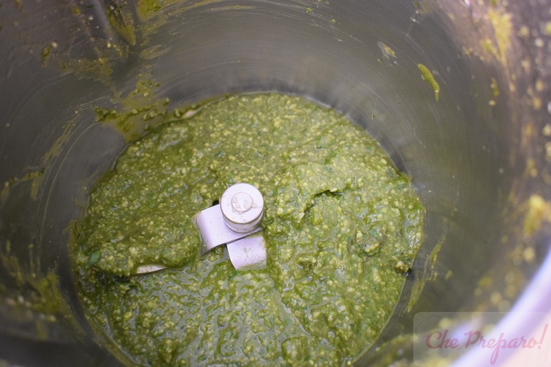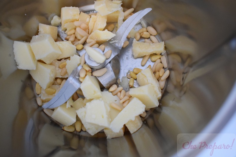 • Intanto nel boccale mettete 15 g di pinoli e 70 g di  parmigiano a tocchetti, 30 g di pecorino a tocchetti, 1/2 spicchio d'aglio, un po' di sale, le foglie di basilico ben asciutte e frullate il tutto 20 secondi velocità 4. Aggiungete 100 g d'olio extra vergine d'oliva e frullate altri 20 secondi velocità 4.