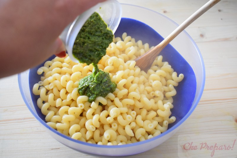 • A questo punto aggiungete 60 g di pesto e amalgamate il tutto. La vostra pasta al pesto genovese è pronta per essere servita. Guarnite il piatto con qualche foglia di basilico fresco e una spolverata di parmigiano grattugiato.