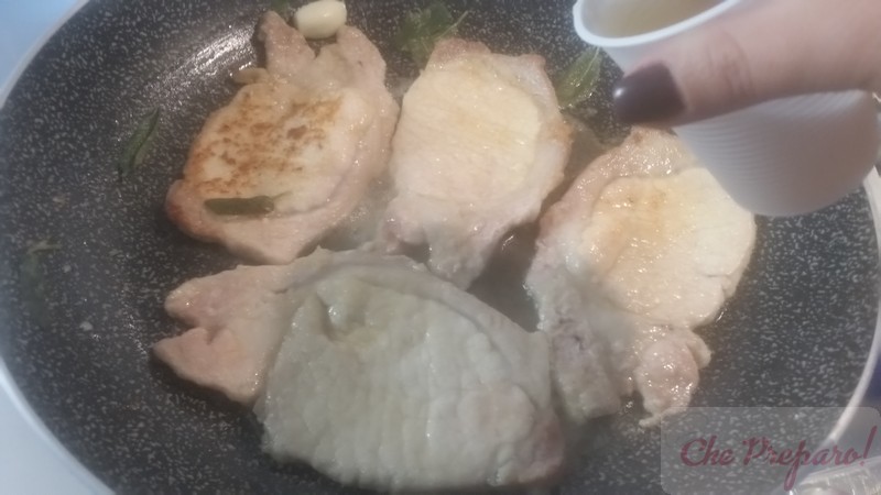 - Trascorso questo tempo, alzate un pò la fiamma e aggiungete 1/2 bicchiere di vino bianco e lasciate sfumare. Cuocete le fette di arista fino a quando il vino non è evaporato del tutto.