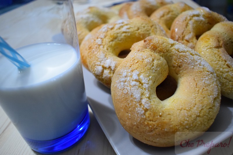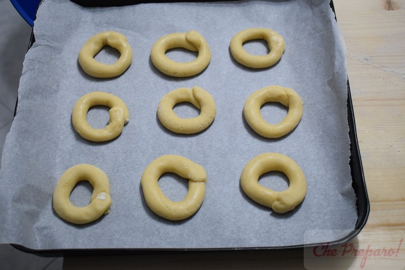 - Posizionate le ciambelle in una teglia foderata con carta da forno lasciando un pò di spazio tra loro. In una ciotola sbattete 3 tuorli e spennellateli sui taralli e cospargete con un cucchiaino di zucchero semolato. Adesso infornate i taralli a 180° per 10/15 minuti circa. Quando saranno dorati tirateli dal forno e lasciateli raffreddare.